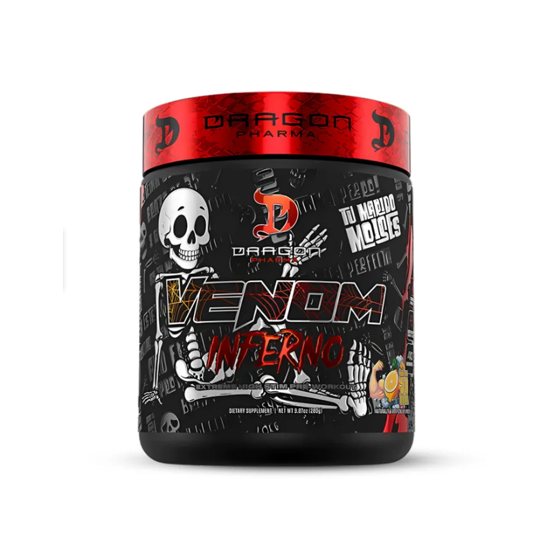 Venom Inferno de Dragon Pharma es un pre-entreno extremo de alta potencia, diseñado para atletas que buscan una energía explosiva, enfoque láser y bombeo muscular máximo en entrenamientos intensos, combinando cafeína, beta-alanina y vasodilatadores como Nitrosigine® para superar límites y maximizar el rendimiento con efectos termogénicos y prolongada resistencia.